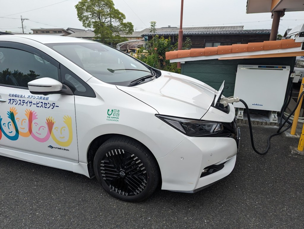 公益財団法人日本財団さまより助成金を頂き、EV車(ニッサンリーフ)1台とV2H(充放電装置)を整備しました。